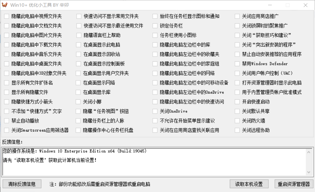 工具仅300k大小,麻雀虽小五脏俱全!支持一键隐藏优化电脑中的视频、文档、下载、音乐等文件夹,显示控制面板、显示网络,一键关闭Windows Defender,禁止Windows系统自动更新功能,关闭0ndeDrive、小娜等。每一步操作都在反馈信息内透明显示。
