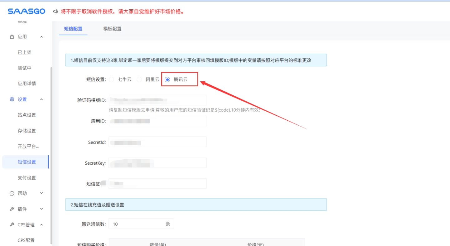 把腾讯云替换为sms.qf.wiki短信,saasgo后台选择腾讯云