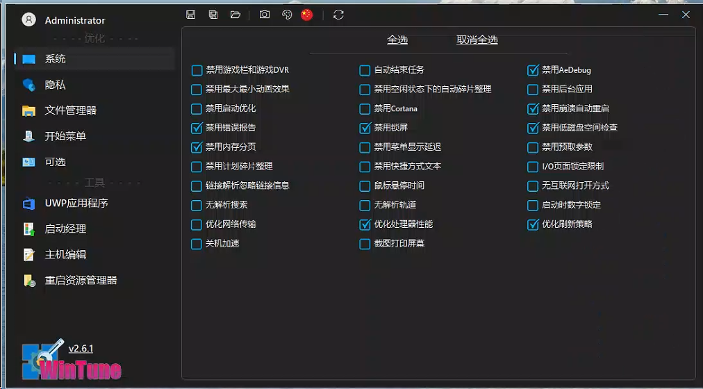 文章标题:WinTune-v2.6.1,一款开源免费的window系统优化工具,大小仅2M不到。